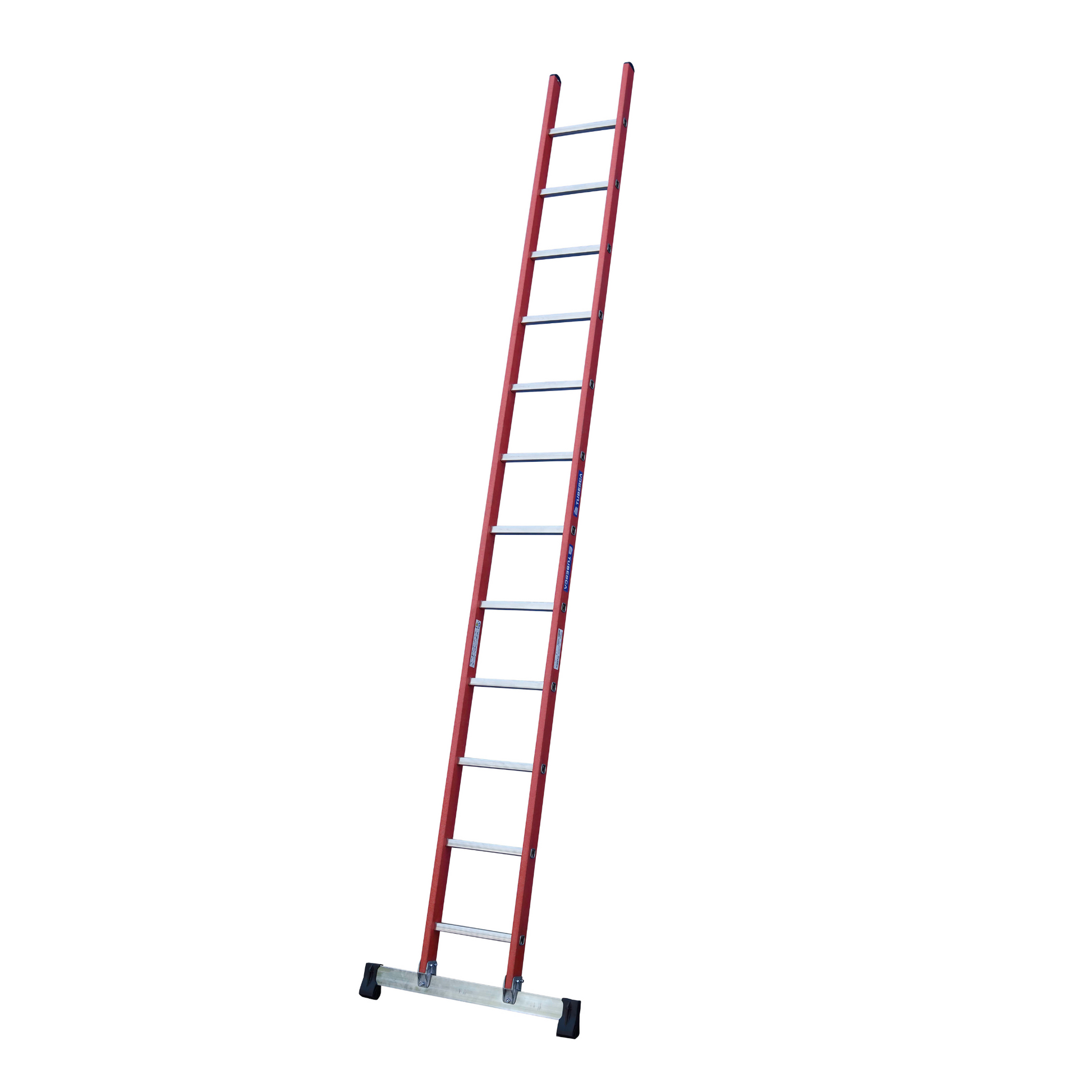 Denna stabila och lättanvända enkelstege är utrustad med vangstycken i glasfiber och steg i aluminium, vilket gör den både hållbar och säker – särskilt vid elarbeten. Tack vare glasfibermaterialet kan stegen användas vid arbete med spänning upp till 10 000 volt, helt utan risk för elektriska stötar.