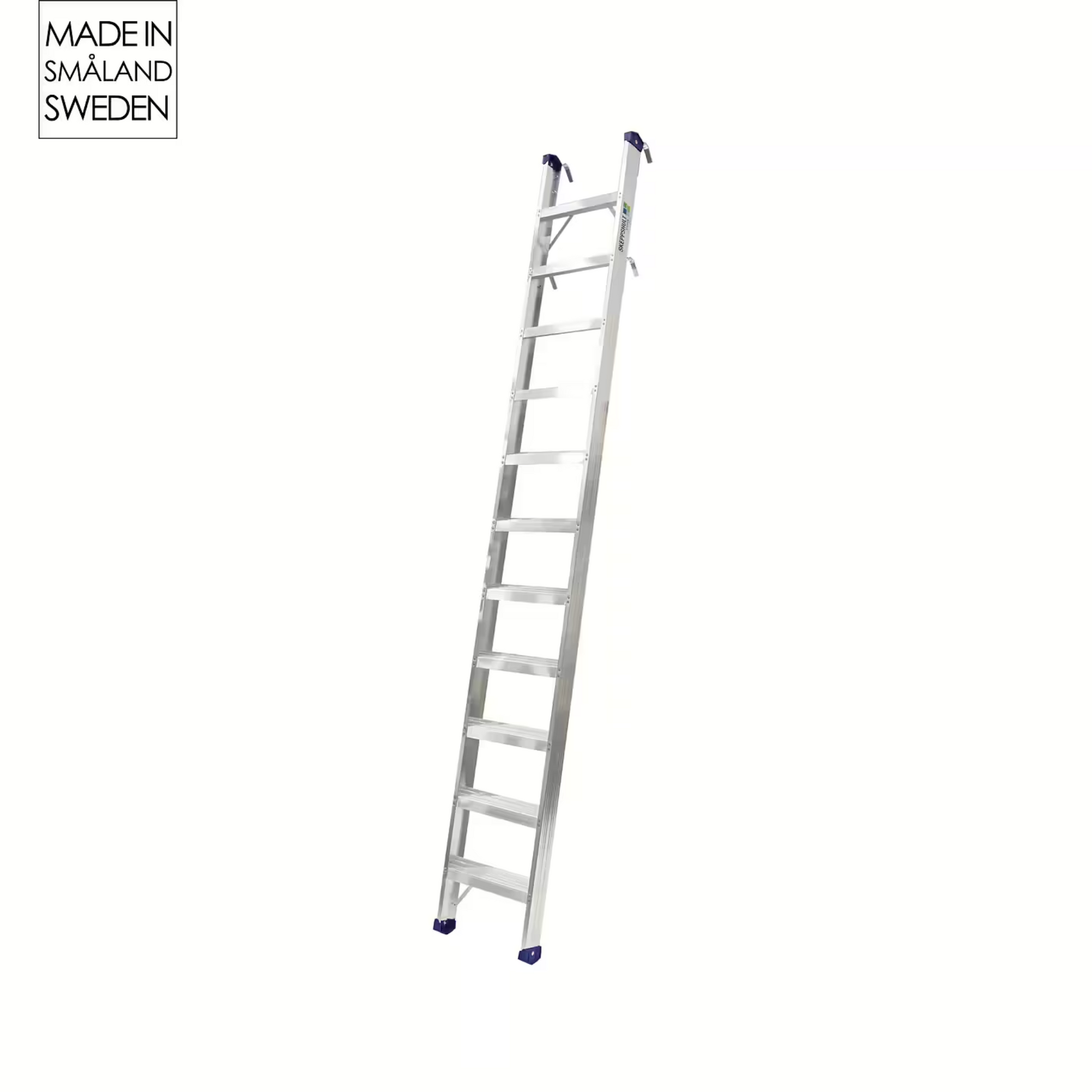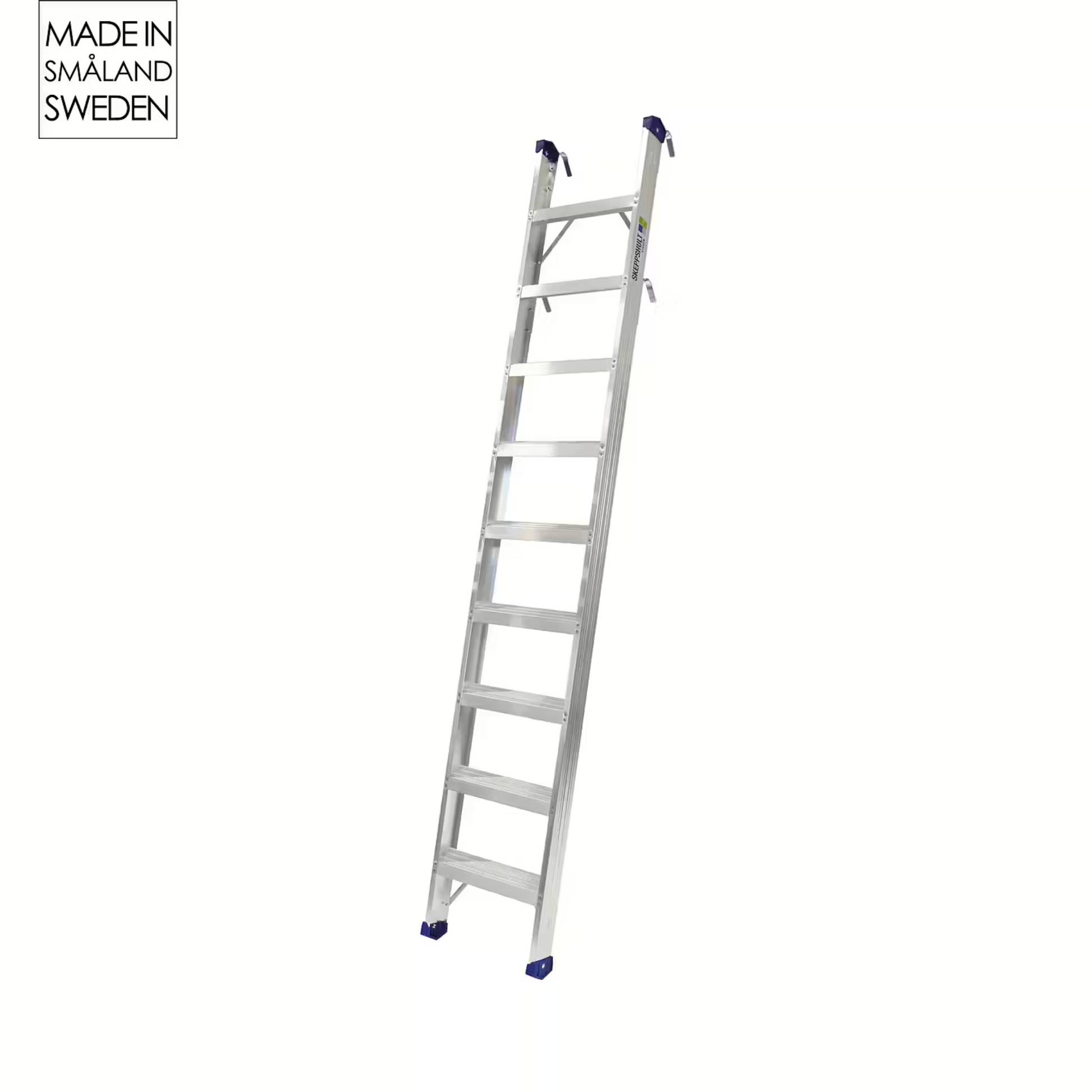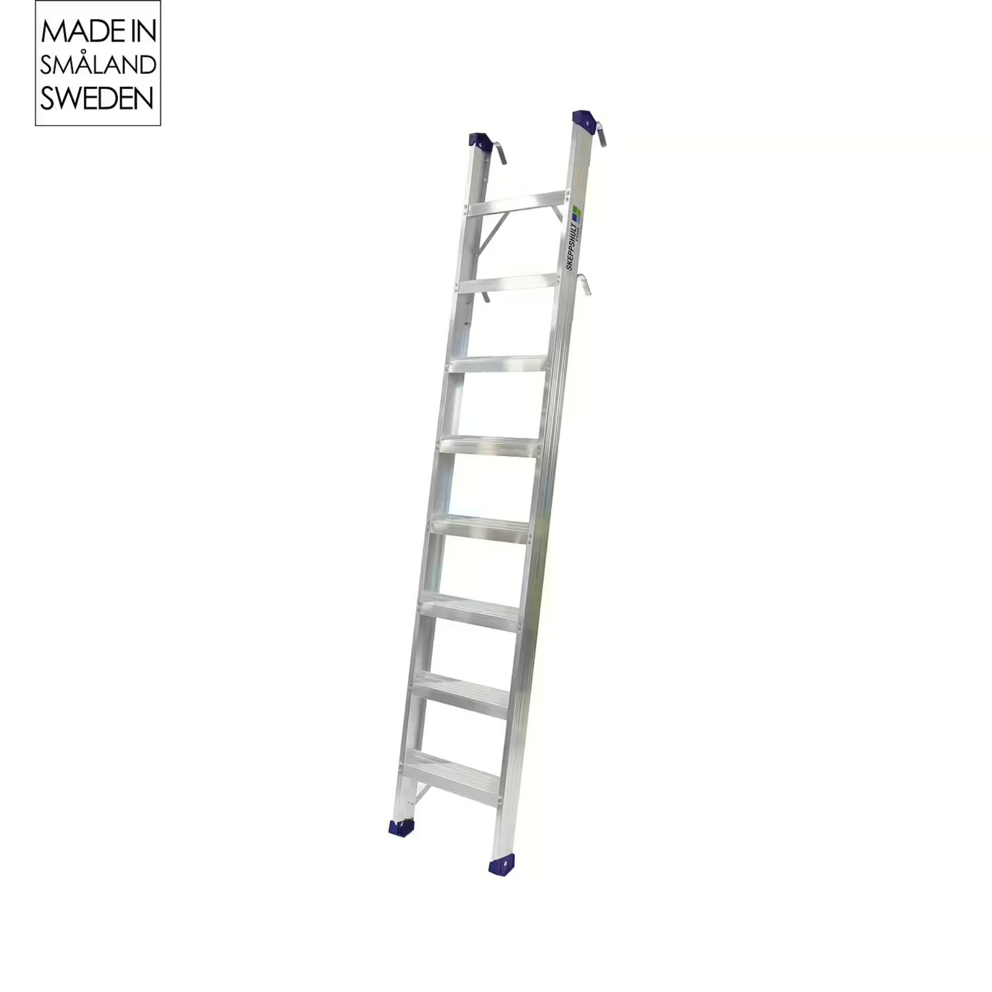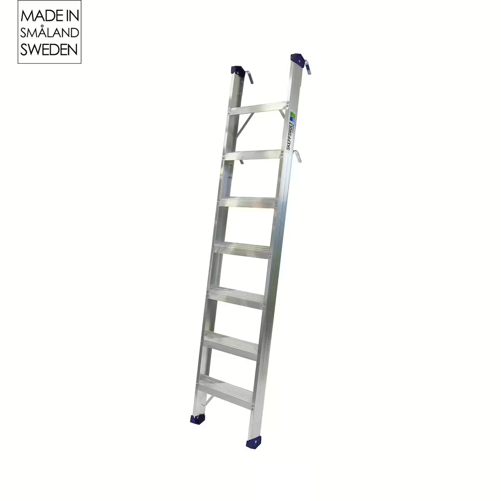 För ökad säkerhet kan lagerstegen kompletteras med handledare, och de kraftiga glidskydden tillsammans med toppmonterade krokar förhindrar att stegen glider vid användning. Tvärstag både upptill och nertill bidrar till ökad stabilitet.