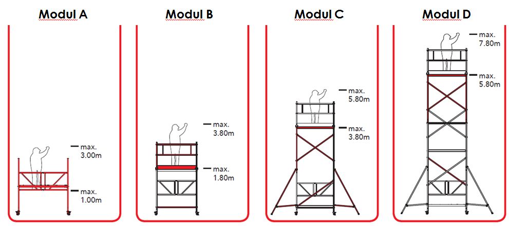 Fyra moduler är tillgängliga (A, B, C, D). Vill du komma upp på en plattformshöjd 5,8m, D-modul så behöver även beställa till modul A, B och C om du ej har det sen innan. Detta är plattformshöjden för de olika modulerna:
