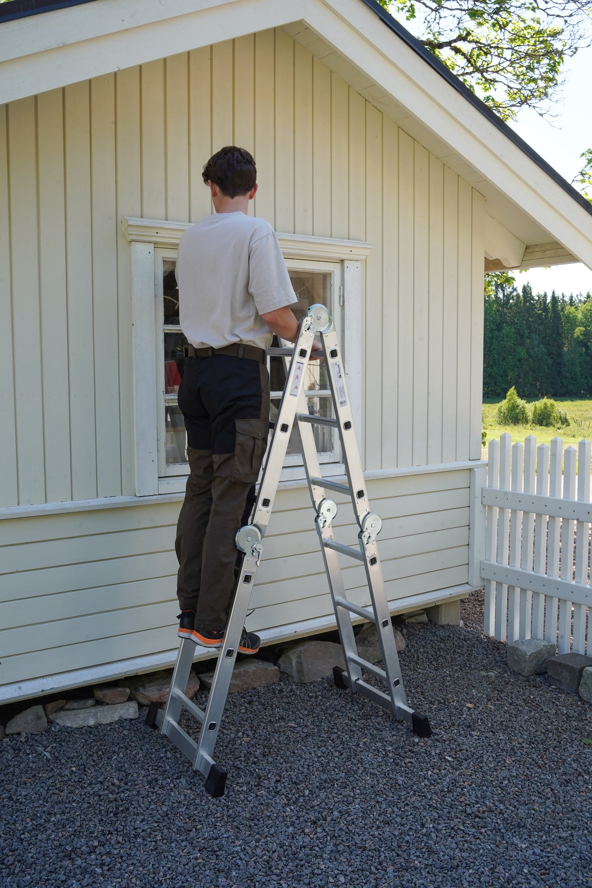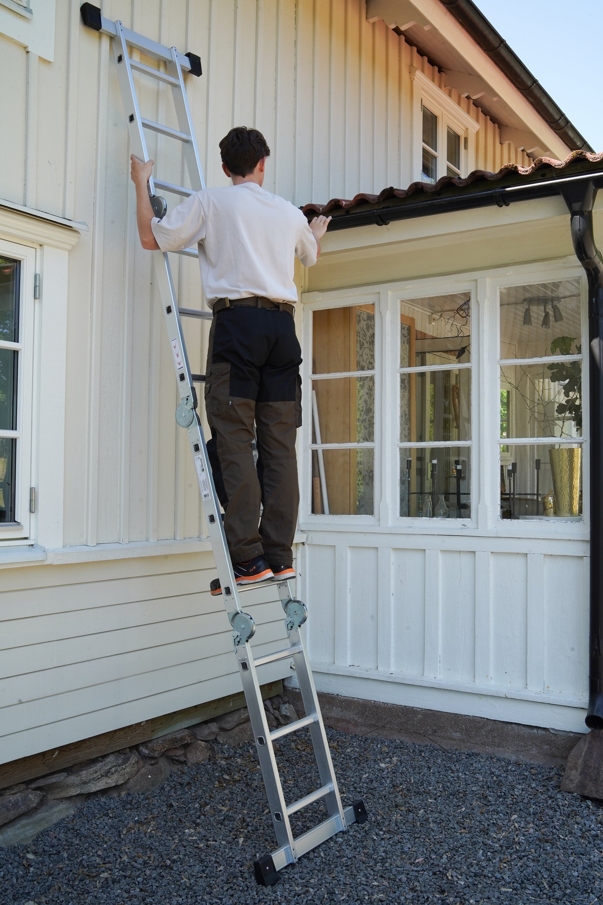 Universalstege Standard är en mångsidig och lättanvänd stege med flera uppställningsalternativ. Den är godkänd för användning både som fristående stege och anliggande stege, vilket gör den idealisk för en mängd olika arbetssituationer.