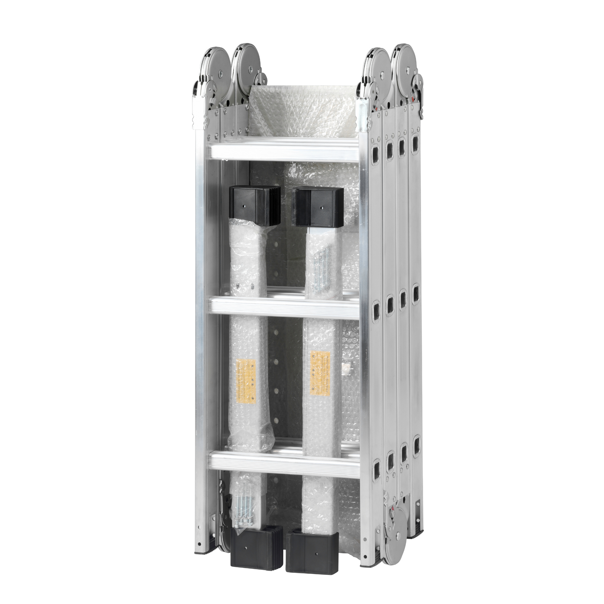 Tillverkad i lätt men hållbar aluminium och försedd med kraftiga leder i förzinkat stål för maximal stabilitet och lång livslängd. Stegen fälls enkelt ihop till ett kompakt format (0,96 × 0,37 × 0,27 m), vilket gör den smidig att transportera och förvara.